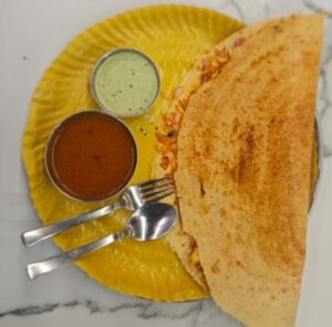 It is a crispy dosa spread with spicy Mysore chutney and filled with flavorful masala.